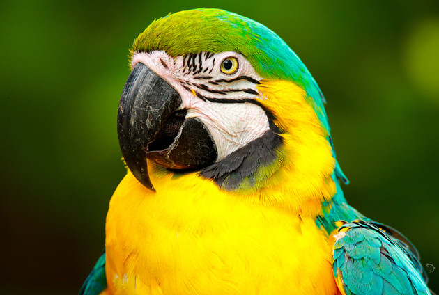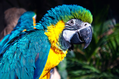 One aloof and one curious parrot. ย Lovely closeup capturing their expressions.