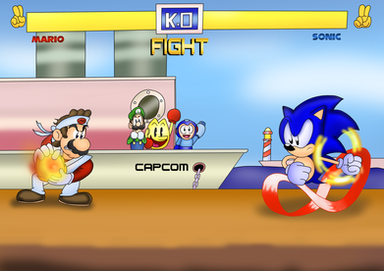 Here's the first one, and the obvious example of mascot vs. mascot: Mario vs. Ryu. These two are the posterboys for the company (I know some may argue that Megaman is the Capcom mascot, but Ryu is definitely the Capcom posterboy these days), are both the frontrunners in their respective crossover fighters (Mario in Smash and Ryu for pretty much every Capcom crossover fighter) and they both end up having fire powers.