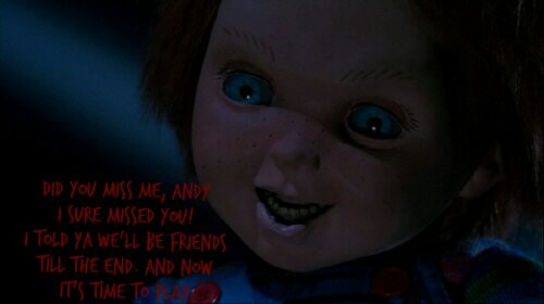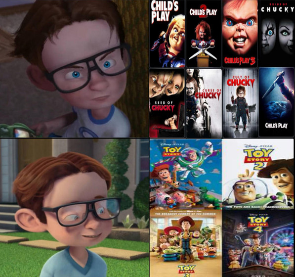 IDK why but when I first saw Childs Play 2 I thought of Andy and Kyle running around in the yard while Kyle was dressed like Hans and Andy was dressed like Anna from Frozen singing love is an open door and Chucky sitting in the background like w...t...f? I'm so weird.