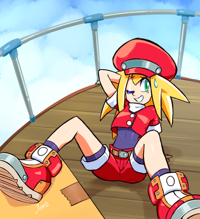 It was a beautiful day outside where the Flutter was docked. MegaMan Volnutt and Roll Caskett were currently seated at the table near the TV. MegaMan had on his bulky blue armor, and Roll was wearing her usual red shorts, crop shirt, and hat. He black under layer were also secured. But two things that were strangely missing from her current getup was her shoes and socks. Roll felt at ease and more comfortable being barefoot for the time being, as the cool, metallic floors felt nice after having worked the day before on fixing the ship.