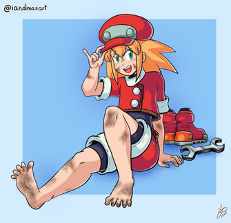 With a giggle, Roll gave a reply to his enthusiasm about the mission. She lifted her leg up and gently rubbed her foot on MegaMan's left calf.