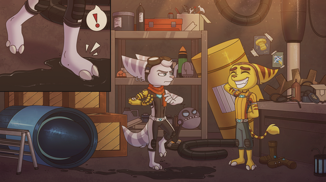 As Roll began to climb down the ladder, she winced at the feeling of the cold metal bars against her bare feet. Thankfully, this was very short lived, as she quickly reached the bottom. She jumped off the second to last ladder bar, landing on the cool, metal floor. Roll walks over towards a shelf, she crouches down in order to reach the shining laser.