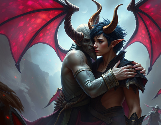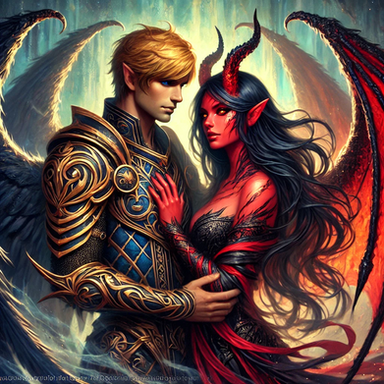 #ai #characterdesign #cosplay #couple #digitalart #epic #fantasyart #femalecharacter #love #magic #magical #malecharacter #shorthair #videogame #longhairgirl #gamecosplay #angel #angelwings #demon #digitaldrawing #divine #embrace #romance #romanticcouple #wings #stablediffusion
