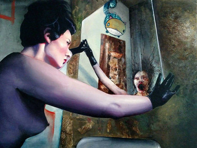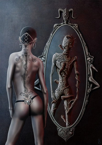 The soft light and somber palette really set the strange, mysterious mood perfectly. Β And the realistic details (wall texture, hair, light and shadow) pair with the figure in the mirror in a truly unsettling way. Β Great work.