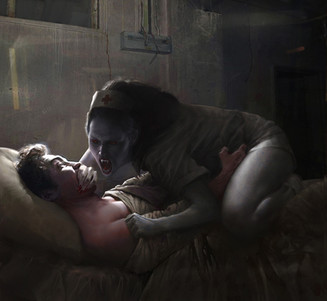 Artistically this is wonderful, spooky, and haunting. The color is just right with a cold tint that really sets the mood. If I had to pick it apart, because to be a critique one must find something to be critical of, and since your art is beyond critique I must go after the concept, because it's completely subjective, and hard to defend without venturing into pure personal opinion. So my ridiculous critique, of this fine work, might be the placement of the ghost. HA! For some reason, my first reaction to this image was, that it would be scarier if the ghost were behind her, as the distance between her and the sink was not great enough to fit the person she was seeing in the mirror, Β and she would know instinctively that there was nothing really in front of her, but if it was behind her she couldn't just dismiss it, and would have to turn around to see if it was there. I may be just projecting my long held fear of ghosts standing behind me. It's a wonderful image. Bravo!