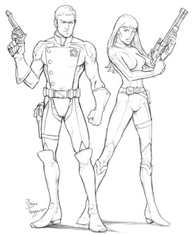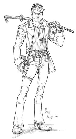 Goat is a young vagabond that finds himself the focal point of a revolution. He is a skilled pilot of a racing vehicle called a stun runner. You can see the steering mechanism for his vehicle hanging from his belt. This is a character from a science fiction epic my friend Aaron Brough and I have had in mind for years. The original was done with water color and then sketched over with ink pen. The original is about 12 inches tall.Related content