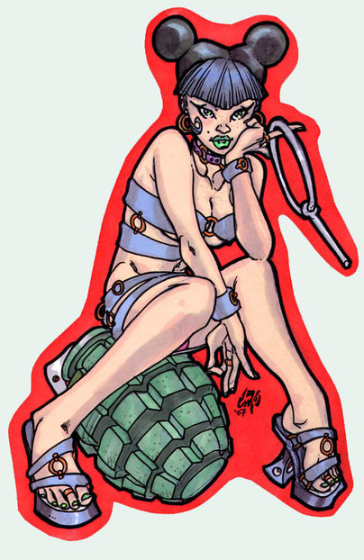 This is the last "quickly done in the hotel room" pics. Got a chance to scribble all over it with Prismas just for kicks.Yes, kiddies, I know the orange outline is garish and crap but that's what happens when you drink and draw. HARRR!