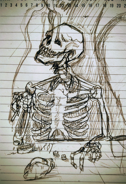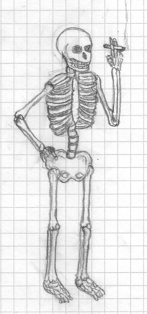 Yeah... It's a skeleton, and it's smoking. Are all you smokers out there getting the message yet?!!Ahem... anyway, this sketch took me a few hours to draw and shade. It was a while ago, so I don't remember specifically. I referred to a bone book I have to ensure that the skeleton was as anatomically correct as I could manage. The hands could possibly be better.