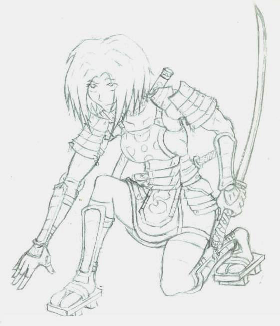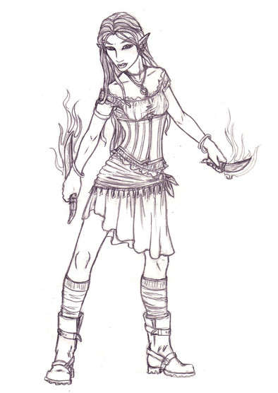Jadwin, a character for an Exalted roleplaying game i was in for.... about a week or two, before the game kind of imploded. At least i was inspired to do a picture of her. Loosely based on one of my favorite World of Warcraft characters, my rogue named Faelan.This one was done about four or five months after the Ral piece; colored in kind of a rush but i think i'd gotten a little bit more of a handle on it with a few digital color pieces between the two. Random decorative background because i felt like it.