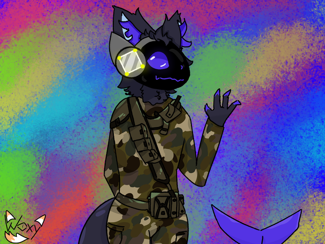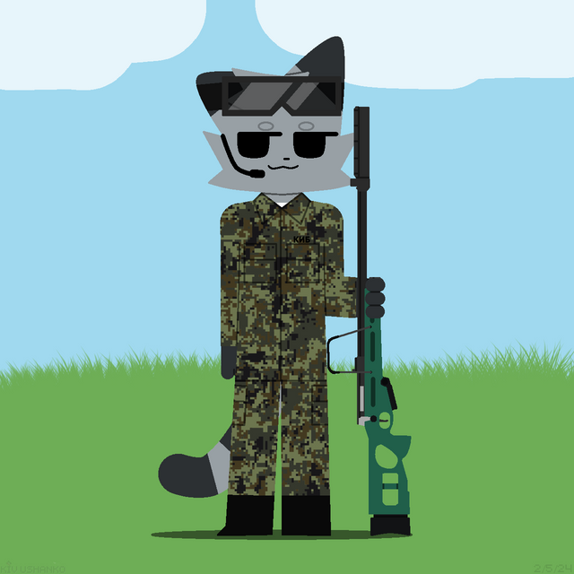 A pfp I made of my recent adopt Streamline the tropical floofshark wearing Aretian camouflage and equipped with his marksman rifle (scope removed because I didn't properly plan around it and made most of the gun).