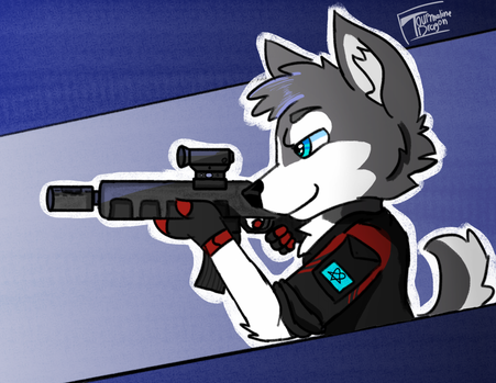 The suit itself has a built in hydration system (w/ the helmet, not seen in this pic) to help keep him comfy and safe during combat. Given the vast range of furry species in the Union City universe and their unique needs, virtually all combat systems need to have some way to acclimate for their users if they are out of their native or comfortable habitat and aquatic creatures on desert planets are certainly no exception. He is equipped with a rattlesnake sniper rifle with an aluminium body, milspec sight, and LED-laser combo attachment.