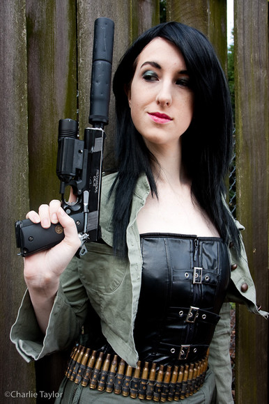 hmm...is there anything hotter than a cute girl in black with an uzi? I think not! Very cool pic, I luvs it.
