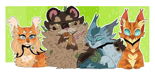 Woo~! So happy to finish this; some of you might have seen me asking for critique w/ the sketch version of this - so, here we are! I'm glad to finally give Squirrelstar and her kits a proper lineup :]OLD (applicable) REFS: