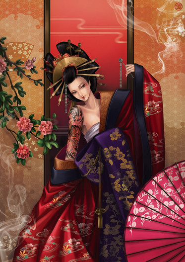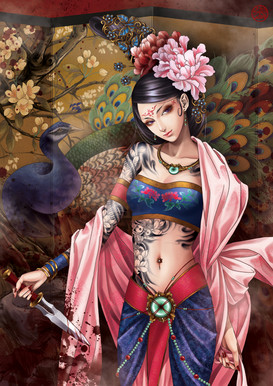 The first word i come up when i look at this pic is elegance, it's just..that hair, flowers, the blood, her pose and expression..everything moves so elegantly, you really have wonderful style!