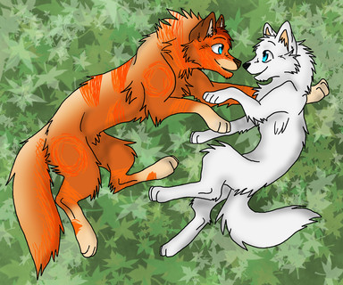 "You ready?" Flint asked Reece, preparing to dive into the river. "Yeah." Reece nodded and dipped a paw in the water. She quickly pulled it back, surprised by the cold. Flint laughed. "You get used to it." He said and with that, jumped in. He resurfaced a few moments later, and motioned for Reece to do the same. Reece hesitated a second. She thought. Without waiting one more second, she dived in. Soon she came to the surface, shocked by the cold. "I don't know how you River wolves bear this cold." She shivered and attempted to place her paws on the rocky floor. She watched with envy as Flint seemed to just naturally swim and stay in one place. Flint finally noticed her trying to stand, and swam over. "Try this." He said, demonstrating. Reece tried to copy him, and he grinned. "Almost there. Just.." His head disappeared under the water, and she felt her legs being moved. "There!" He came back to the surface, and smiled. Reece was surprised to see that it was actually helping. "Can we try swimming underwater now?" Reece asked, happy with her progress. "Sure. Follow me. There's a calm spot around here..." He vanished again. Reece sighed and stayed where she was. Flint came up after quite a few moments, grinning sheepishly. "Forgot to hold up my tail. Follow that, and I trust you remember how to swim?" Reece nodded and he disappeared. After a second or two, His tail poked up. It started moving forward, and Reece followed. Finally they came to a spot where the current wasn't pushing as hard. "Here. Now dive under." Flint appeared, instructed, then went under. Reece took a deep breath and pulled herself under. It was surprisingly deep there, and there were many feet before the bottom. Reece floated with Flint for a moment, then he slowly swam forward and started moving her paws. At one point their noses touched. Reece pulled away in embarrassment, looking around. Luckily, there were no wolves to see, only schools of fish. Flint grinned, and Reece looked away, but she was smiling herself.