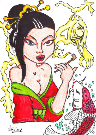 Very nicely drawn! Just drawn with the few Japanese stereotypes such as the kimono, the orange/red shades of the illustrations with the mountains and the sunrise ("The land of the rising sun"), as well as the dragon...