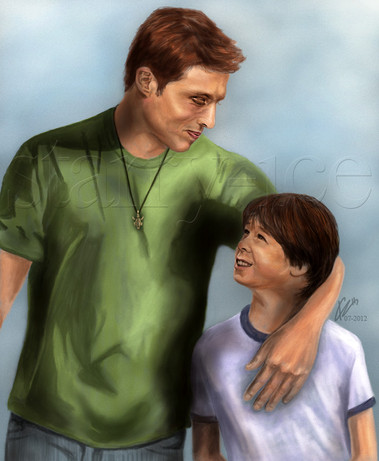 It's beautiful work, it is! You have talent with those pencils, I must say~ One little bit of constructive criticism: Dean's head is a tiny bit too big for his body. At least, that's how it looks to me. Though, for how spot on it looks to the actual people, you did a DAMN good job. The shading and tones are great. Cas's and Dean's faces are great. I especially love Cas's blue eyes.