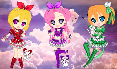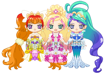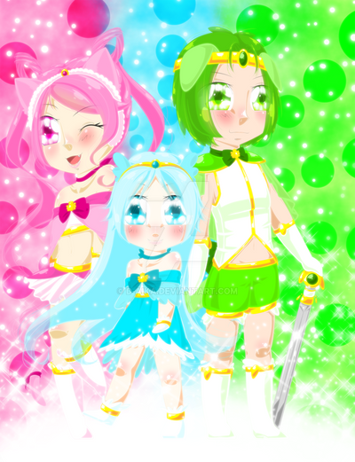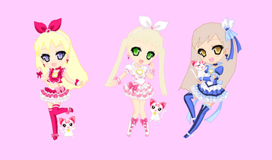 "Princess of harmonous songs! Cure Harmonia!" "Princess of glittering lights! Cure Shimmer!" "Princess of inspiring fairytales! Cure Fable!"Aaah~ Princess cures~ Another fave! Cure Harmonia was my first Cure OC and now she has a team! Alongside the fairies, Frangrance the cat and Balm the Pomeranian!