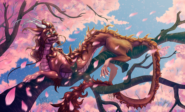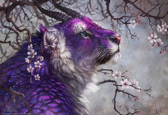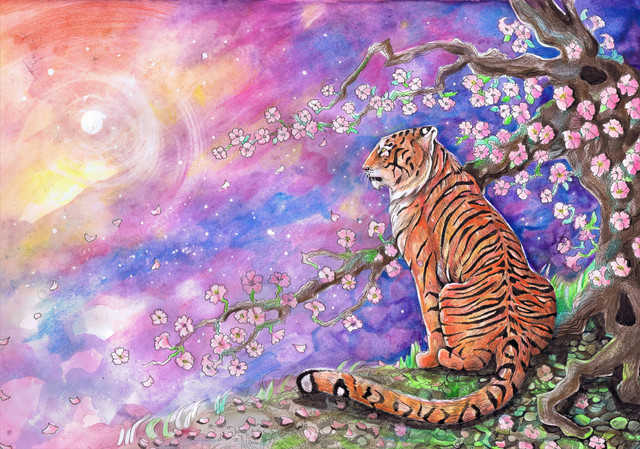 I love how the sleeping tiger looks so surreal; like it's fur and limbs are flowing away, just like a spirit should. Love this piece <3