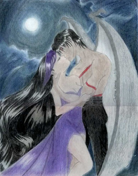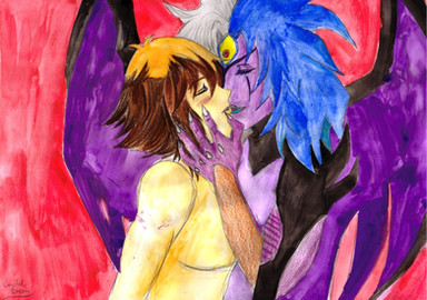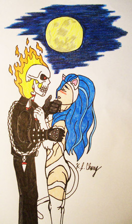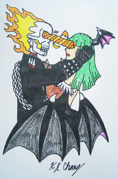 Morrigan uses her long kiss on Johnny Blaze/Ghost Rider, hoping to drain every of his strength and soul out of him until death does him apart. Will Johnny be able to get a hold of himself and stop her from accomplishing her goal? Inspired by the Batman comic strip when Poison Ivy delivers her venom kiss on Bruce Wayne/Batman, hoping to kill him, 9th crossover fan art of Ghost Rider (Marvel) and Morrigan Aensland (Capcom).Drawing pen and colored pencils