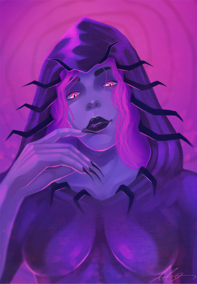 #black #blade #dagger #dark #demon #knife #pink #pinup #purple #queen #throne #demoness #demongirl #digitalart #digitalartwork #digitaldrawing #digitalillustration #digitalpainting #digitalportrait #pinupgirl #purpleeyes #purplehairgirl #royalty #royalprincess #pinupsexy #darkskinnedgirl