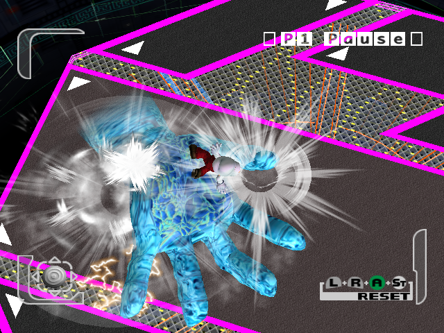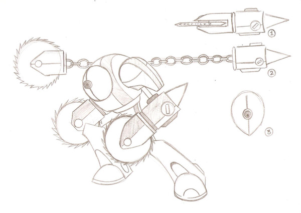You begin to wonder whether Pokey had lost his sanity when the floating mecha-eye glows a soft rose... and morphs into the figure of a young boy. Two lifeless eyes peer down at the ailing Pokey. Lights near the base of the mecha-boy's abdomen and left eye flash off and on. An X-shaped scar on the mecha's forehead blazes in a deep crimson.