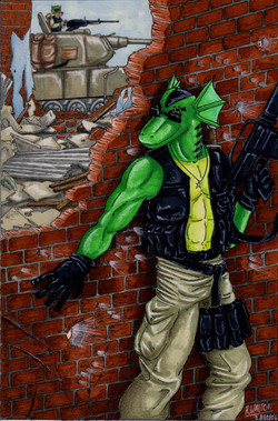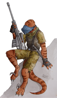 What the HELL is it with this new catagory system!? the previous was WAY less confusing!Anyhow this is an old drawing by where he first drew his new guerrilla character, a raptor sniper featured here [link] and here: [link] Sicne this was a gift drawing for me I was supposed to have coloured this along time ago, but I didn't find my inspiraiton untill now.