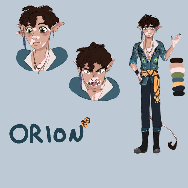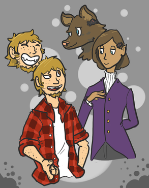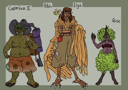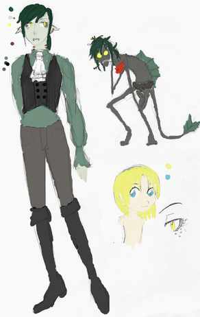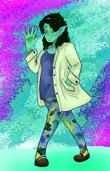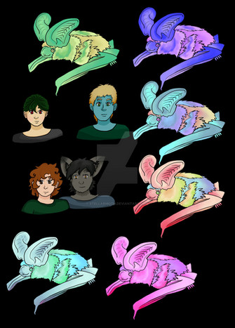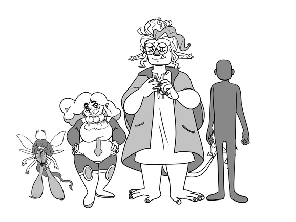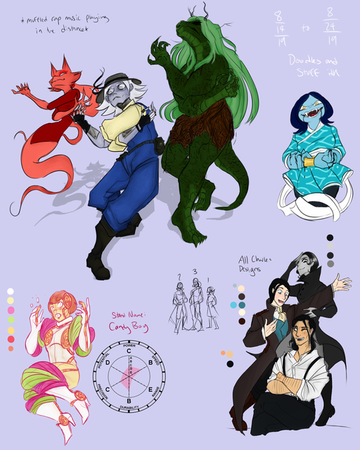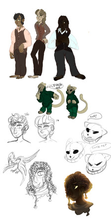 The hands are sign language for A, B, and C. That's Robert and Dmeytri at the bottom, the girl with the blue hair is Delphinium, the guy in the trench coat is from a photo of Junji Ito (I should've drawn him with the cute cat ears), the tulip's name is Stan, short for Stanmantha, and the person in a robe is "some person in a robe." They've stolen my favorite socks and purple yoga pants. Also they're half Amphibian(you know, fish people), half Haman(pointy-eared elf people with anime hair colors).