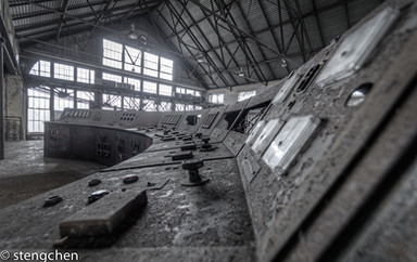 Kind of spooky how it looks like they walked away in the middle of servicing the turbines...Β Nice piece -- great effect!