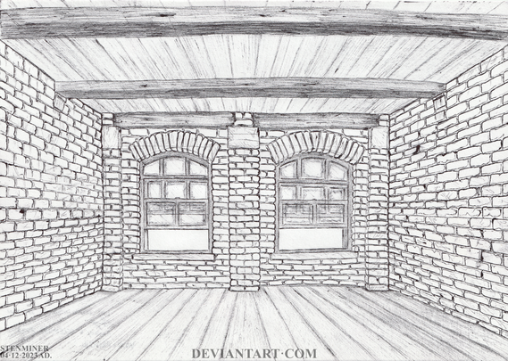 24.3.2019: Size A4:A Victorian corridor, made of dark-oak & arsenic, fallen into ruin.