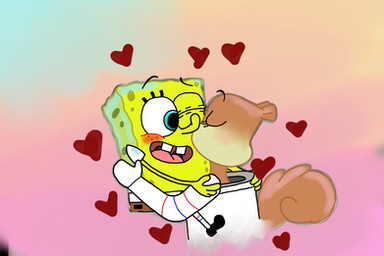 In questo Fan Art, SpongeBob porta un regalo per Sandy che lo ricambia con un bacio.