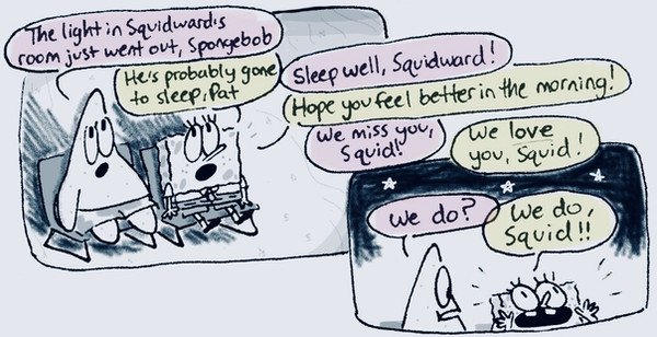nothing except....*jerks head at Spongebob and Patrick* watch out Squidward! Your serene Sunday is coming to an END