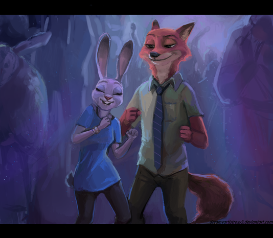 With the debut of the teaser trailer for Disney's upcoming animated film "Zootopia", there has been a plethora of fan art for the characters of fox Nick Wilde and rabbit Judy Hopps. This is one of the best I've seen so far! The poses are very dynamic and fluid, and the brushes and colors used for Nick and Judy are just beautiful. The subtle shading and lighting give them depth and a 3-dimensional quality instead of just being "wooden" and flat, which is a lot more appealing. The expressions perfectly match the character's personalities(or at least what we've seen of them), with Nick's sly smile and Judy's grumpy pout. This is just such an awesome piece of art that makes me look forward to the film with anticipation!