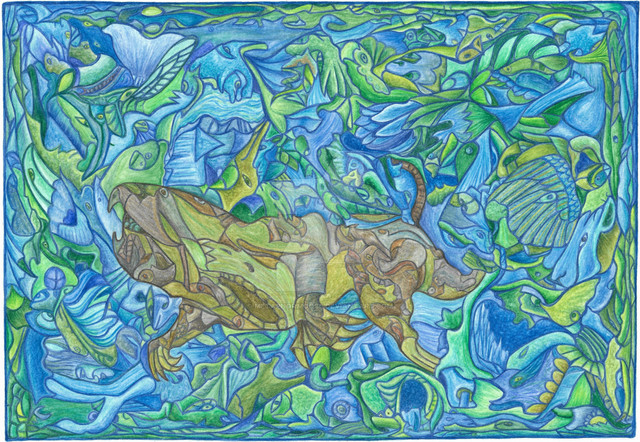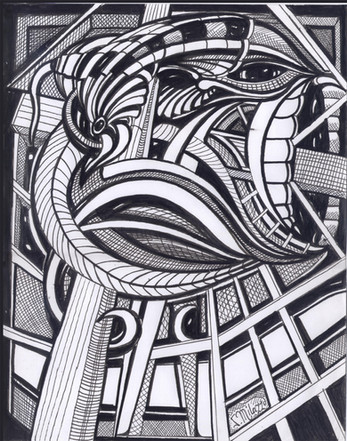 The powerful use of black is great, it almost seems like a black canvas with colour painted on top. Certainly very striking, especially with the pink. I also like how the 'turtle bird' part is mirrored below, almost like a big black shadow underneath - Or above, depending on which way up it is... Theres a definate sense of movement here.