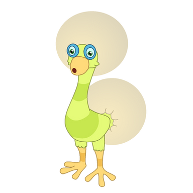 The Quibble resembles a turquoise swan (or similar bird) with two heads - one with a purple crest and one with a green crest. It sits in a small circular pond, surrounded by a ring of five black and eight white stone tiles, arranged like the keys of a standard piano keyboard. Each head has a long beak; the purple head's beak has a bit of a bend near the tip. It plays the keyboard by striking the tiles with its beaks.