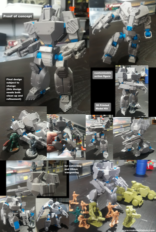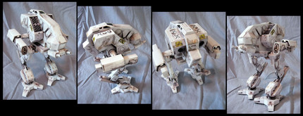 The latest in my generic scratchbuilt vehicles, a bipedal mech.To begin with I made a sketch of what I wanted and followed this with a card prototype of the core before being reproduced in plasticard. Two such cores were then detailed in different ways to produce a gun armed mech and one with two missile launcher arms.
