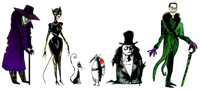 I gave Riddler additions to his wardrobe, that I believe Tim Burton would have given Riddler, including an tailcoat and a pair of pants, instead of wearing a leotard covered in question marks or copying Frank Gorshin's suit and tie covered in question marks or Jim Carrey's suit and tie covered in glowing neon question marks, and his unassuming question mark cane being secretly a deadly sword-cane instead of just a prop. It makes more sense for him to wear a green question mark costume if he started wearing it as his carnival job costume, and he secretively starts committing deadly puzzling crimes, like bombing buildings, while using his public job as just a unassuming, unsuspecting, carnival worker to hide in plan sight at the carnival, making Riddler more of a complete character like a person that could exist and less of a cartoon caricature of a real person. The original comics Riddler's carnival roots suits Tim Burton's carnival circus imagery. I have a hunch that Tim Burton would have cast quirky creepy Steve Buscemi for the Riddler in the '90s, instead of lovable zany manic comedian Robin Williams or spastic goofball comedian Jim Carrey, so I used vintage '60s Don Knotts art for the Riddler's head because Steve Buscemi looks like Don Knotts. I used the vintage art for this to make it look authentic and professional. The Riddler in the comics had that sort of lean face but cartoony Dick Sprang art and generic superhero art, the Don Knotts/Steve Buscemi face gives the Riddler a more distinctive realistic look. Today, Bill Skarsgard could be Tim Burton's Riddler pick, he looks like a younger Steve Buscemi.