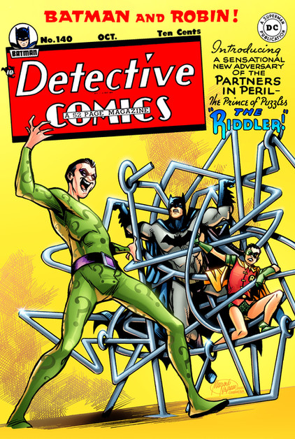 This is a collage of the Riddler's history with scans of the first appearance of the Riddler in Detective Comics #140 (1948) "The Riddler" written by Bill Finger and art by Dick Sprang [reprinted in Batman Arkham: The Riddler (2015)] and Batman #362 (1983) "When Riddled by the Riddler ..." written by Doug Moench and art by Don Newton [reprinted in Batman Arkham: The Riddler (2015)], art by Bill Fraccio from Four Color #1341 The Andy Griffith Show (1962) "Undercover Man" written by Don Segall and art by Bill Fraccio, art by Bob Kane and Jerry Robinson from Batman #16 (1943) "The Joker Reforms" written by Don Cameron, art by Bob Kane, Jerry Robinson and George Roussos [reprinted in Batman: The Dark Knight Archives vol. 4 (2003) and art by Tim Burton from "Swirly Eyed" (1993) [reprinted in The Art of Tim Burton (2009)], art by Bill Fraccio from Four Color #1341 The Andy Griffith Show (1962) "Undercover Man" written by Don Segall and art by Bill Fraccio, art by Gene Colan from Detective Comics #532 (1983) "Laugh, Killer, Laugh" written by Doug Moench and art by Gene Colan [reprinted in Tales of the Batman: Gene Colan (2011) vol. 2 (2018)], Riddler art by Jose Luis Garcia-Lopez from Batman: Confidential #28 (2009) "A New Dawn Part Three" written by Nunzio DeFilippis and Christina Weir and art by Jose Luis Garcia-Lopez [reprinted in Batman: King Tut's Tomb (2010)] and art by Tim Burton from "Swirly Eyed" (1993) [reprinted in The Art of Tim Burton (2009)] [that I put together and colored] and the Riddler description quotes from The Encyclopedia of Comic Book Heroes: Batman (1976) by Michael L. Fleisher, "His real name is Edward Nigma, and uses his name initial, coupled with his last name, producing the word enigma, as therefore, his preoccupation with puzzles and riddles. Years ago, while Edward Nigma was still a young boy, his history teacher announced a contest to determine which of her students could assemble a jigsaw puzzle the fastest. The night before the contest, Nigma pride open his teacher's desk and took a photograph of the assembled puzzle so that the next morning, when the other students were introduced to the puzzle for the first time, he was able to win the contest easily by capitalizing on his knowledge of that the finished puzzle would look like. Having won the puzzle contyest, E. Nigma soon became known as a puzzle expert among his friends - who didn't know that he had cheated.