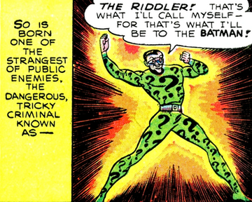 As an adult, Nigma, as the Riddler, operates a puzzle booth at a carnival, where customers compete with him for prize money. If the customer successfully solves Nigma's puzzle, he wins a cash prize, but if the customer failed to solve the puzzle, and Nigma succeeded, the customer would pay a fee to Nigma. In each case Nigma would rig the puzzles in advance to ensure that his customers would always lose. But the time came when the small pickings of a carnival attraction did not satisfy the crooked puzzle master. Nigma muses to himself - 'I'm clever enough at puzzles to baffle even the police - and Batman, too! I'll commit puzzling crimes - and fix the puzzles so I'll always win!' The Riddler wears a green carnival costume - decorated with a black question mark."
