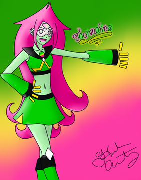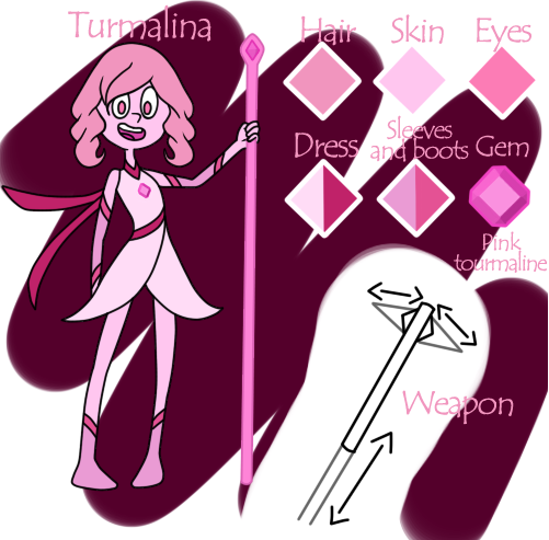 Pink Tourmaline is based of Milli from Team Umizoomi. Her weapon is a hook. She is also able to shapeshift her hair into anything she wants. Her diamond is Yellow Diamond, but originally it was Pink Diamond. She kinda has a hatred to the Crystal Gems.