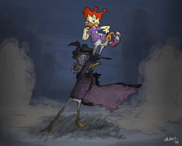 I think its Great how Negaduck, despite being darkwing's polar opposite, still finds time to raise Negagosalyn in the negaverse. I also like the look of conflict on negaduck's face like he's a Frankenstein's monster trying to decide between hugging her & killing her.