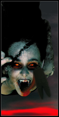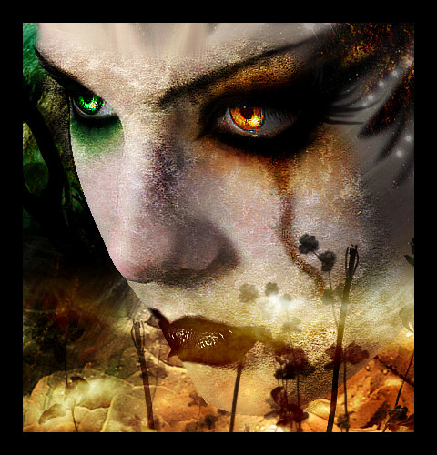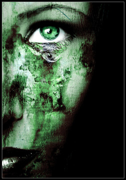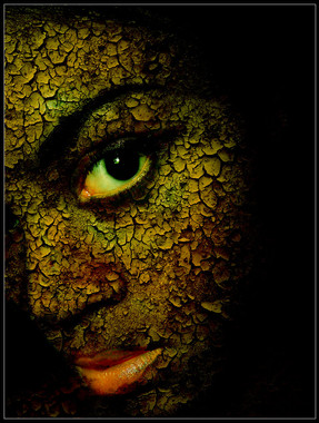 A great piece. Love the colours and the unity they've given to the piece, the way you've repeated the red in the eyes and the mouth and the poison green in the brows and the background. The suggestion of plaster crumbling also adds to the theme. I might be inclined to crop the image though, below the lips so only the face is visible...
