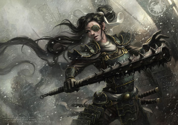 Very nice, despite the scar she's still beautiful. It's hard to tell if the sword she's carrying over her shoulder is an actual katana, which normally would go in her belt next to the wakizashi short-sword, or if it's the longer no-dachi, which was supposedly actually an inferior blade normally used by samurai who couldn't afford a horse to chop the legs out from under enemy horses. If you have ever seen the original Seven Samurai it's a no-dachi that Toshiro Mifune's character carries, it's part of why they knew he's not a real samurai since he doesn't even realize that it's not a katana. (I know, probably TMI, but I figured it would be fun to share the little knowledge I have.)