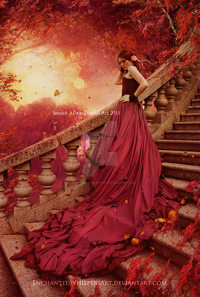 Woman sitting on the steps in a red dress with rose petals flying in the wind.Special thanks to for letting me use one of her photos as a reference to help paint this piece.