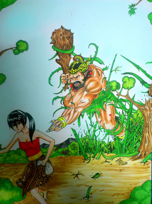bushes and trapped the giant inside. But the giant was so strong that he got out of it and continued chasing Timun Mas. Again the giant almost