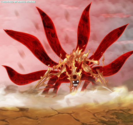 This is one of the greatest 6-Tailed Nauto pics I've seen, and I believe it's one of his coolest forms. The skeleton is a sweet touch to it unlike Four Tails, and it really gives you an idea for what the pain must be like seeing the strands of skin/chakra keeping the skeleton attached externally like that.