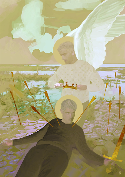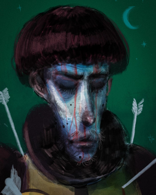 at least I see it. Look. Arrows are hitting his body, and his beard is full of flowers, and with those hits he got, there is petals flying away from his beard all around. is that means that he losing a bit of his "light" with every hit he got from the life? Idk, but I see it like this. still his eyes are glowing, and I think this man have a lot of power inside himself to face all life's hits, survive the battle, and became even more stronger, still not lose his sweetness, and light (those flowers in his beard)