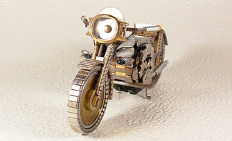 A commissioned work I did. The man holds a rose that loses petals to the wind, the woman catches them in a net. Made almost entirely from guitar/bass strings and nail polish (the headlamps each have a bit of broken reflective glass in them).Related content