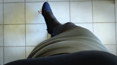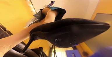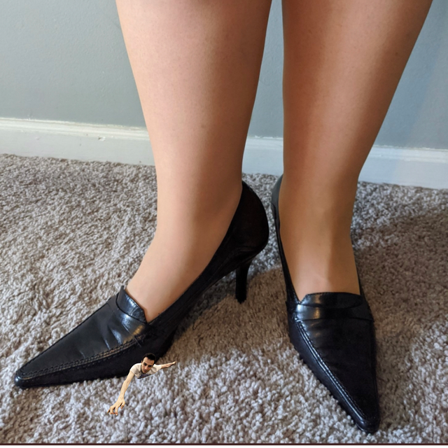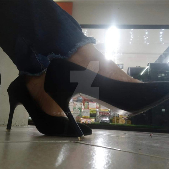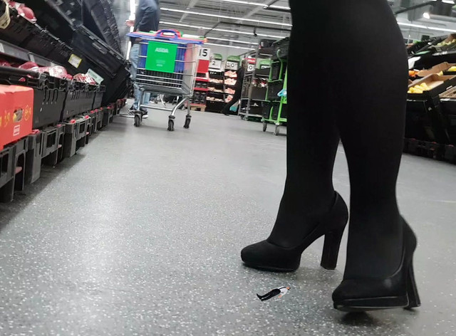 - May I interest you in our new product? Hello? Can you even see me or hear me? Heeelllo! This is ridiculous. Why did I even take this job. She will step on me before she noticed me. I'll have to quit before I become a stain on someone's shoe...Original photo by womenscalves