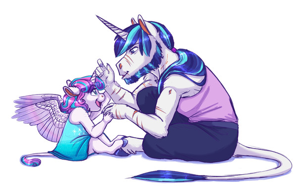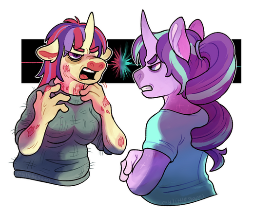 It was then that a hand over the counter snatched her wrist and squeezed with such force that the bell dropped to the floor with a final choked jingle. She hadn't even heard them come down from the second floor! Before she even knew what was happening, she was yanked up face to face with....hoooo Celestia above in Canterlot, she was such a pretty unicorn with shadows under her eyes and an overall dark aura about her. But most of all, she looked incredibly pissed.